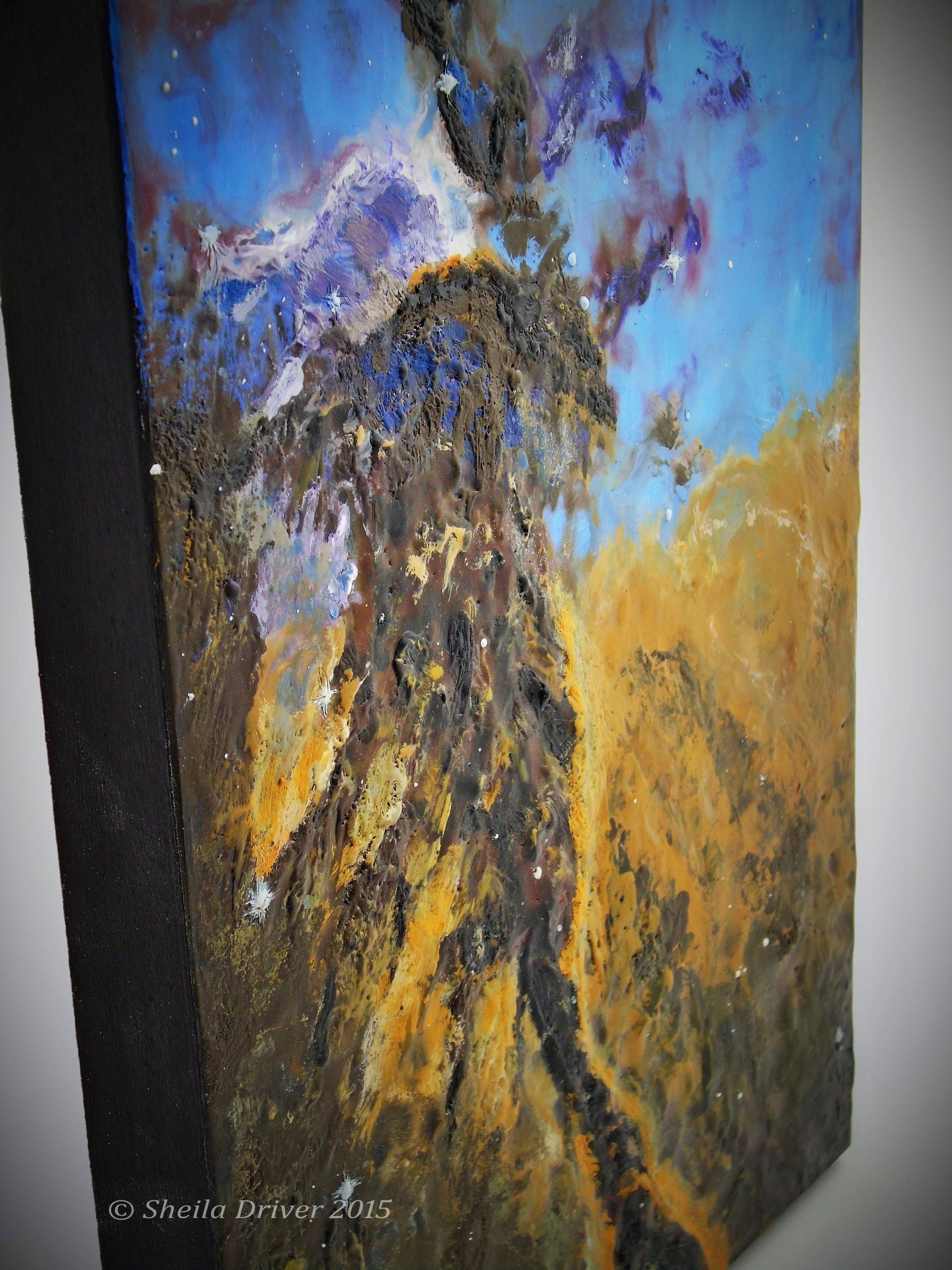 The Eagle Galaxy from the side This side view highlights the textural detail of an encaustic wax painting the Eagle Galaxy on panel. Share This: Click to share on X (Opens in new window) X Click to share on Pinterest (Opens in new window) Pinterest Click to share on Facebook (Opens in new window) Facebook Like Loading...